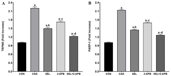 In rats with CAD, cardiac OS was indicated by increased MDA, TNF-α, TOS, and ROS, and decreased GSH, GSH-Px, SOD, and TAS. Elevated ROS oxidize DNA and acti-vate the PARP-1/ADPR/TRPM2 pathway []. Antioxidant enzymes include preventing ROS-mediated oxidative damage, neutralising ROS, and preserving the integrity of cell membranes. Consequently, diminished levels of these defences make the cells vulnerable to death. In vivo investigations showed a reduction in antioxidants after exposure to CAD [,], and CAD has been shown to increase ROS and impair cardiomyocyte cell viability []. In light of the explanations, CAD treatment caused significant increases in ROS, PARP-1, and TRPM2 levels (Compared to CON, p < 0.05). In contrast, a significant decrease in ROS, PARP-1, and TRPM2 levels was detected after separate administration of SEL and 2-APB treatments. On the other hand, in the SEL+2-APB group, the co-administration of SEL and 2-APB treatments made the treatment even more effective. Therefore, in this study, we demonstrated for the first time that one of the molecular pathways for the protective effects of SEL and 2-APB against CAD-induced cardiac injury may be the ROS-induced PARP-1/ADPR/TRPM2 pathway in rat cardiac cells.