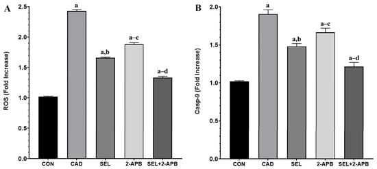 The impact of 2-Aminoethyl diphenylborinate (2-APB) and selenium (SEL) on reactive oxygen species (ROS) (A) and Casp-9 (B) values in cardiac damage caused by cadmium (CAD) (mean ± SD., and n = 8). [a p < 0.05 comp. CON, b p < 0.05 comp. CAD, c p < 0.05 comp. SEL, d p < 0.05 comp. 2-APB groups, and p values were obtained according to one-way ANOVA test (post hoc Tukey) results].