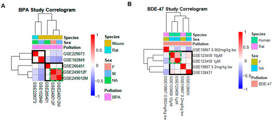 Cluster analysis for each EC based on similarity in gene signatures defines main EC study clusters. Correlograms were generated via the hierarchical clustering of gene signatures of ECs based on Spearman’s rank correlation coefficients of transcriptome response (logFC) between treatment and control groups for BPA (A) and BDE-47 (B). Studies were labeled using the GSE accession number, gender, and dose. Color of the heat map indicates Spearman’s rank correlation coefficients where red tones represent positive correlations and blue tones represent negative correlations. Solid black lines represent identified EC clusters used for downstream analysis. Green dashed lines highlight the groups with better correlation. The factors such as pollution, species, and sex are shown above the cluster map. Reproduced from [25]. © 2023 The Authors. Published by Elsevier Ltd.