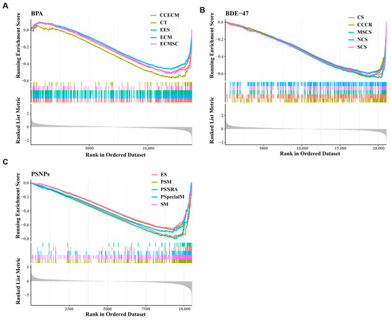 GSEA between the exposure and the control group in BPA (A), BDE-47 (B), and PSNPs (C). Top 5 gene sets were shown: Collagen-containing extracellular matrix (CCECM), extracellular matrix (ECM), external encapsulating structure (EES), extracellular matrix structural constituent (ECMSC), collagen trimer (CT), mitotic sister chromatid segregation (MSCS), chromosome segregation (CS), sister chromatid separation (SCS), nuclear chromosome segregation (NCS), condensed chromosome and centromere region (CCCR), postsynaptic membrane (PSM), synaptic membrane (SM), postsynaptic specialization membrane (PSpecialM), excitatory synapses (ES), and postsynaptic neurotransmitter receptor activity (PSNRA).