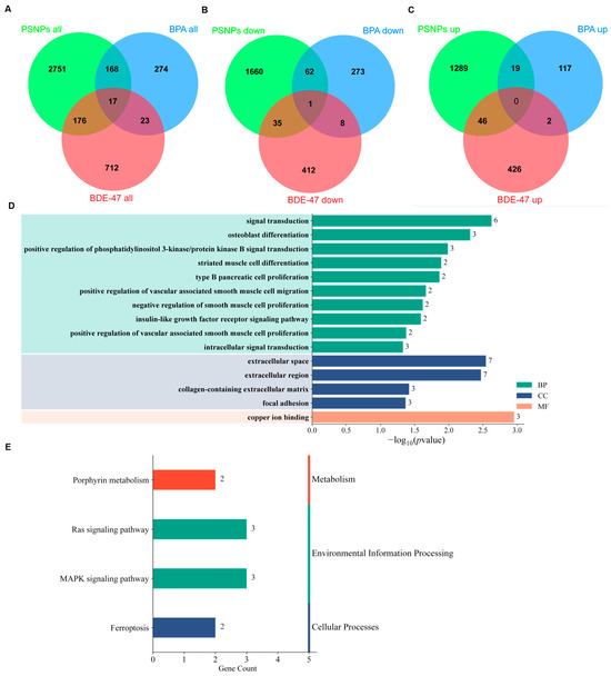 To further investigate the potential similarities and differences in the mechanisms of action of the three ECs, we performed GO and KEGG analyses on all DEGs from the gene datasets of the three EC types to identify their conserved molecular functions, biological processes, and pathways. While no common genes were found in the shared GO terms across all three ECs (Figure 4A), we observed a large number of shared genes between PSNPs and BPA, with more than 2000 common genes in the protein binding category. Specifically, the shared processes between PSNPs and BPA may reflect their roles in regulating intracellular and extracellular signaling, maintaining cytoskeletal stability, and potentially inducing pro-inflammatory responses. Enrichment in processes such as “fibronectin binding” and “collagen binding” particularly suggests that these two pollutants might influence the structure and function of the extracellular matrix, thereby disrupting cell environment interactions. However, as a persistent organic pollutant, BDE-47 may impact cellular functions through different molecular targets or more specific pathways. For example, it can impact embryo development by inducing mitochondrial dysfunction or endoplasmic reticulum stress [30]. In a subsequent KEGG analysis, we successfully identified common pathways shared by the three ECs (Figure 4B), including the MAPK signaling pathway, cancer pathway, Rap1 signaling pathway, and PI3K-Akt signaling pathway. These pathways play crucial roles in cell proliferation, survival, differentiation, and stress responses, and are closely linked to the onset and progression of various diseases [31,32]. We found that the three pollutants shared partial pathway convergence, suggesting that they may have shared regulatory elements in inducing neurotoxicity. This could provide a basis for exploring their common neurotoxic mechanisms.