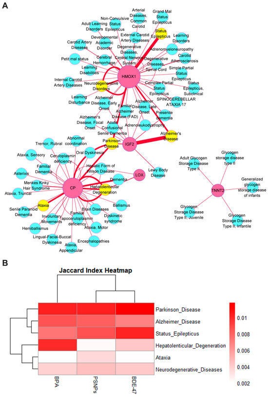 Subsequently, we used the Jaccard similarity coefficient to measure the similarity between the complete differential gene data before and after treatment with the three pollutants and the gene lists obtained from the CTD database that are specifically associated with the six diseases mentioned above. The results showed that the three pollutants were more strongly associated with Parkinson’s disease, Alzheimer’s disease, and status epilepticus. Among them, BPA showed more significant correlation with hepatolenticular degeneration, which is a genetic disorder whose pathogenesis is closely related to defects in ATP7B [43], leading to abnormal copper metabolism and resulting in a series of neurodevelopmental disorders. [44,45]. In brief, although we only conducted an association analysis between the genes of the three pollutants and the genes of six typical diseases without delving into the mechanisms by which they trigger diseases, our results provide some support for the possibility that the three pollutants may share similar mechanisms in causing neurodevelopmental toxicity (Figure 7B).