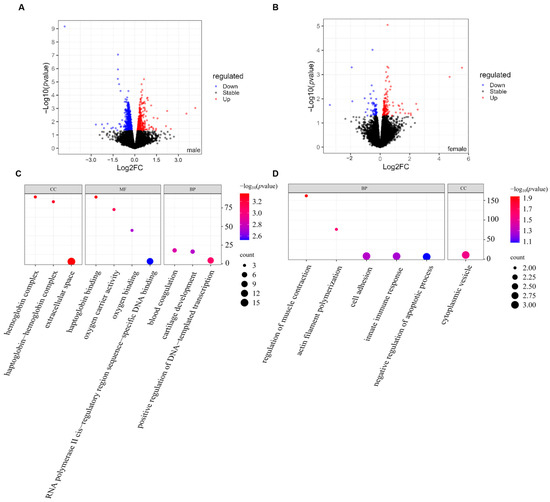DEGs analysis of different genders in the BPA exposure group. (A,B) The volcano plot of DEGs by gender (p < 0.05, red indicates upregulation, and blue indicates downregulation). (C,D) The GO analysis heatmap of DEGs by gender.