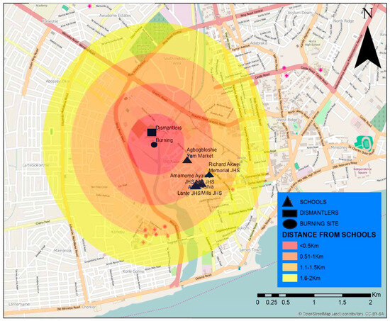The study was conducted in four schools located near the Agbogbloshie e-waste recycling site in Accra, Ghana. Agbogbloshie is one of the largest informal e-waste recycling hubs in Africa, where electronic waste is dismantled, burned, and processed under hazardous conditions. The site spans approximately 15 acres and is situated west of the Odaw River. Nearby communities are densely populated and predominantly house informal workers engaged in e-waste recycling activities. The study schools, Ayalolo 1&2 Junior High School (JHS), Amamomo JHS, Ashia Mills JHS, and Richard Akwei Memorial School, are located within a 1 km radius of the recycling site (Figure 1). These schools were selected based on their proximity to Agbogbloshie and their high student populations, which allowed for adequate sampling. The area is characterized by poor air quality, high levels of soil contamination, and significant environmental health risks [6].
