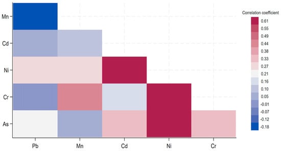 The Pearson correlation heatmap of metal concentrations revealed a moderate to low correlation among each pair of metal concentrations, as the correlation coefficients were all below 0.70 (Figure 2)