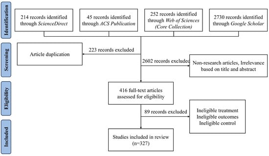 Database searches initially yielded 3241 records. After removing 223 duplicates, 3018 records were screened based on title, abstract, and article type, excluding 2602 non-qualifying records. The remaining 416 records underwent full-text screening, where 89 were excluded due to inadequate treatment, insufficient results, or inappropriate controls. Ultimately 327 studies were included in the systematic review (Table S2).