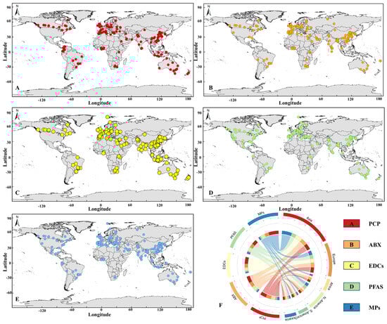 Figure 2. Geographical distribution of literature reports on selected ECs in aquatic environments (based on study occurrence, not concentrations): (A) PCPs, (B) antibiotics (ABX), (C) EDCs, (D) PFASs, (E) MPs, (F) Global distribution of publications on 5 types of ECs.