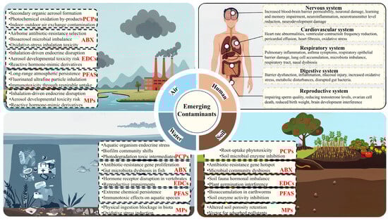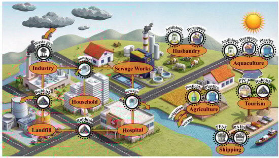 In recent decades, the rapid expansion of global industrialization has driven an exponential surge in the production of synthetic chemicals, with petrochemical products (25.7%), specialty chemicals (26.2%), and polymer materials (19.2%) dominating the market [1]. These anthropogenic chemicals are persistently released into the environment through diverse pathways. Their sources include pharmaceuticals, agriculture, food processing, and electronics manufacturing, leading to the emergence of a novel category of ECs [2]. Unlike conventional pollutants, ECs represent a complex and diverse class of substances identified in recent years due to advancements in analytical techniques [3]. These ECs commonly encompass personal care products (PCPs), endocrine-disrupting chemicals (EDCs), antibiotics, MPs (MPs), per- and polyfluoroalkyl substances (PFASs), and disinfection by-products [4]. Although present in low concentrations, ECs exhibit pronounced bioaccumulation, persistence, and toxicity [5]. Their chemical diversity and variability render their migration and transformation processes highly intricate, thereby complicating ecological risk assessment and remediation strategies [6]. Furthermore, these contaminants pose significant threats to both ecosystems and human health, being linked to neurological disorders, endocrine disruption, cardiovascular diseases, and reproductive dysfunction, thus presenting considerable challenges to environmental safety and public well-being [7,8].