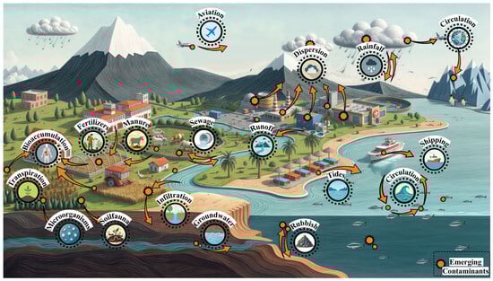 ECs enter the environment through various pathways, including industrial processes, agricultural activities, healthcare operations, wastewater discharge, and landfill sites [24] (Figure 3). Moreover, their migration and transformation in the environment display substantial multidimensional complexity (Figure 4). Global environmental monitoring data reveal that ECs interact across different media and undergo cross-regional transmission via atmospheric circulation, hydrological cycles, and biological chains, resulting in persistent ecological impacts [7,60,61].