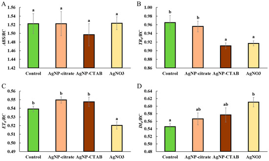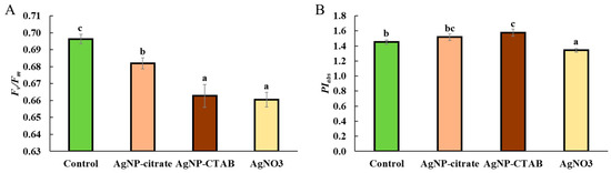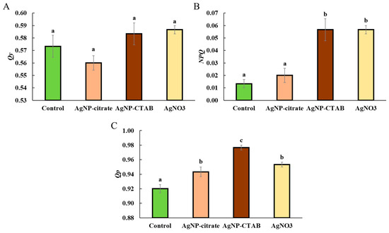 Qp, which indicates the proportion of open PSII centers. The largest increase was observed in the AgNP-CTAB treatment, while the AgNP-citrate and AgNO