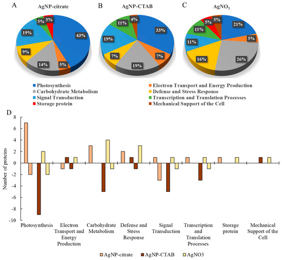 Exposure to both types of AgNPs resulted in a majority of differentially expressed proteins related to photosynthesis, albeit with opposite effects; namely, AgNP-citrate induced the expression of the majority of proteins, while AgNP-CTAB decreased the expression of all proteins. This can be correlated with the results of the maximum quantum yield of PSII, which was significantly higher with AgNP-citrate compared to AgNP-CTAB. Moreover, a decrease in the expression of the large subunit of RuBisCo was observed only after treatment with AgNP-CTAB, while AgNP-citrate upregulated the expression of the small subunit, which, together with the results of photosynthetic parameters, indicates more severe damage to the photosynthetic apparatus after treatment with AgNP-CTAB compared to AgNP-citrate. In addition, AgNP-citrate increased the expression of proteins involved in reactions in PSI and PSII, such as the binding of chl