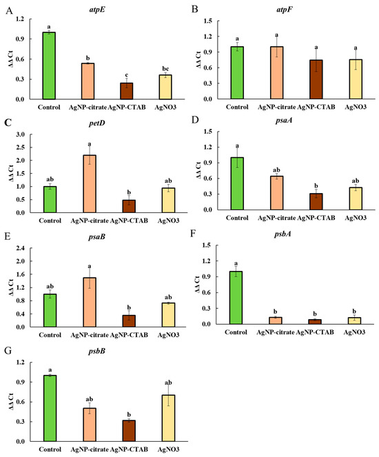 Analysis of the expression of key chloroplast genes associated with photosynthesis revealed that treatment with AgNP-CTAB caused a slightly stronger downregulation of