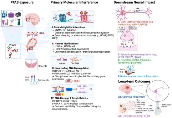 Mechanistic overview of PFAS-induced neurotoxicity and potential transgenerational effects. PFAS compounds, derived from various environmental and consumer sources, cross biological barriers such as the placenta and the blood–brain barrier (BBB), reaching sensitive tissues, including the brain and germ cells. At the molecular level, PFAS exposure disrupts epigenetic and genomic regulation through several key mechanisms: (I) DNA methylation alterations, including hypermethylation or hypomethylation of neurodevelopmental genes (e.g., BDNF, PTEN, H19) via DNMT/TET imbalance; (II) histone modification changes, such as altered H3K4me3, H3K9ac, and H3K27me3 levels, affecting chromatin accessibility; (III) dysregulation of non-coding RNAs (miR-22, miR-19a/b, miR-16; lncRNAs H19, MEG3, XIST), impacting neurotrophic and inflammatory gene expression; and (IV) DNA damage and repair deficits, including γ-H2AX phosphorylation and cGAS nuclear translocation, leading to genomic instability and impaired homologous recombination. These upstream events result in downstream neural consequences: (A) repression of BDNF signaling (via methylation, miRNAs, NRF2 interference), (B) synaptic gene misregulation (DLG4, GRIN2B, SYN1), (C) neurotransmitter imbalance (dopamine, glutamate), and (D) glial activation and neuroinflammation (e.g., ↑TNF-α, ↑IL-6). Long-term outcomes include (Aa) cognitive impairment and (Ab) transgenerational effects marked by altered chromatin states (e.g., H3K4me3, H3K9me2) and dysregulation of germline genes (SYCP3, DAZL), with consequences observable in F1 and F2 progeny. The figure is structured as a left-to-right flow from PFAS exposure to final outcomes. Arrows indicate the progression and direction of effects across molecular and cellular levels. This figure was created using BioRender.com.