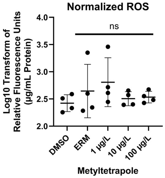 Reactive oxygen species in 7 dpf zebrafish exposed to 0.1% DMSO, ERM, 1, 10, or 100 µg/L metyltetraprole (MTP) expressed as log10-transformed relative fluorescence units (per µg/mL protein). The mean value of the group (±SD) is indicated by the horizonal line and each circle is a biological replicate (one-way ANOVA, Dunnett’s multiple comparisons test, n = 4 biological replicates per treatment). ns = not significant.