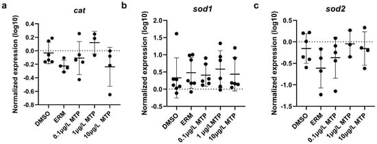 The expression levels of (a) cat, (b) sod1, (c) sod2, in 7-day old larval zebrafish exposed to 0.1% DMSO, ERM, 0.1, 1, or 10 µg/L metyltetraprole (MTP). Each point is a biological replicate, and the horizontal line indicates the mean value of the group (mean ± S.D.) (one-way ANOVA with a Dunnett’s multiple comparisons test, ERM (n = 4–7), 0.1% DMSO (n = 6–7), 0.1 µg/L MTP (n = 5–6), 1 µg/L MTP (n = 3–6), 10 µg/L MTP (n = 4–6)).