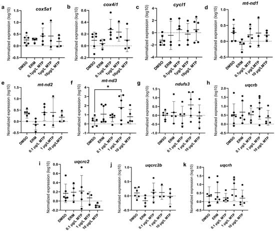 The expression levels of (a) cox5a1, (b) cox4i1, (c) cycl1, (d) mt-nd1, (e) mt-nd2, (f) mt-nd3, (g) ndufs3, (h) uqcrb, (i) uqcrc2, (j) uqcrc2b, and (k) uqcrh in 7-day old larval zebrafish exposed to either ERM, 0.1% DMSO, 0.1, 1, or 10 µg/L metyltetraprole (MTP). Each point is a biological replicate, and the horizontal line indicates the mean value of the group (mean ± S.D.) (one-way ANOVA with a Dunnett’s multiple comparisons test, 0.1% DMSO (n = 6–7), ERM (n = 3–7), 0.1 µg/L MTP (n = 4–5), 1 µg/L MTP (n = 3–6), 10 µg/L MTP (n = 4–6)). Asterisk denotes significant difference at * p < 0.05 from solvent control.