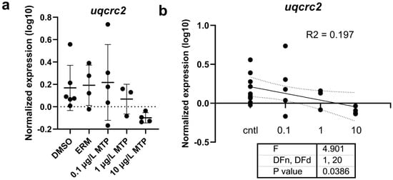(a) The expression level of uqcrc2 in 7-day old larval zebrafish exposed to 0.1% DMSO, ERM, 0.1, 1, or 10 µg/L metyltetraprole (MTP). Each point is a biological replicate, and the horizontal line indicates the mean value of the group (mean ± S.D.) (one-way ANOVA with a Dunnett’s multiple comparisons test, DMSO (n = 6), ERM (n = 4), 0.1% 0.1 µg/L MTP (n = 5), 1 µg/L MTP (n = 3), 10 µg/L MTP (n = 4)). (b) Regression analysis demonstrating a significant reduction in uqcrc2 expression with increasing concentration of MTP.