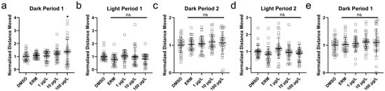 Distance moved (log-transformed) of zebrafish larvae 7 days post-fertilization that were exposed to 0.1% DMSO, ERM, 1 μg/L, 10 μg/L, and 100 μg/L metyltetraprole (MTP). Each point depicts one fish. (a) First dark period, (b) first light period, (c) second dark period, (d) second light period, (e) third dark period. Dunnett’s multiple comparison tests were used to determine differences among groups. Significant differences were noted at * p < 0.05. ns = not significant.