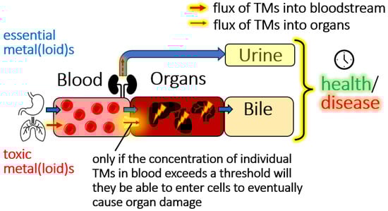 Since the human body contains 79 organs, addressing the organ availability for just a single TMs intrinsically requires one to integrate their idiosyncratic blood-based bioinorganic chemistry with the processes that collectively determine its influx into its respective individual target organ (Figure 2). It follows from these contemplations that there likely is a critical threshold blood concentration for every TMs that needs to be exceeded before it may enter any given toxicological target organ to eventually result in the onset of an environmental disease [4]. To distinguish between tolerable and threshold toxicity TMs concentrations in the bloodstream, two conceptual approaches can be considered: an approach that is based on a model animal-based feeding experiment and a biomolecular mechanism-based approach.