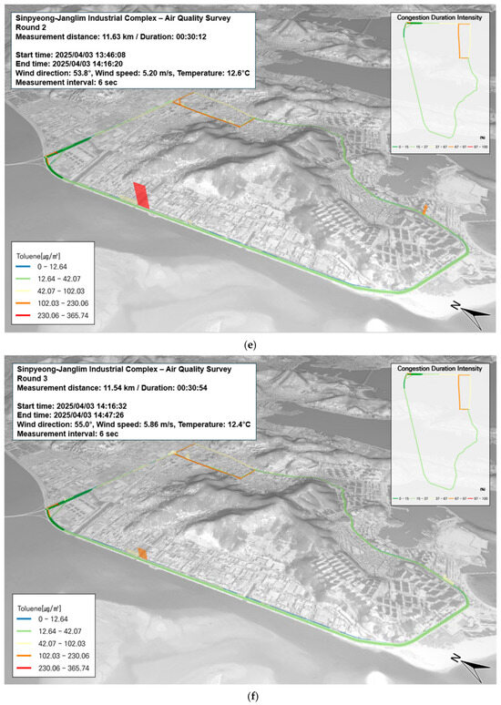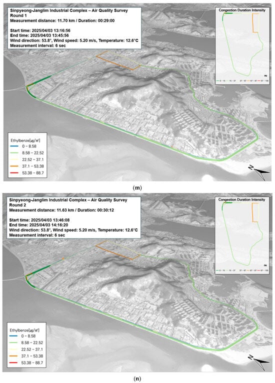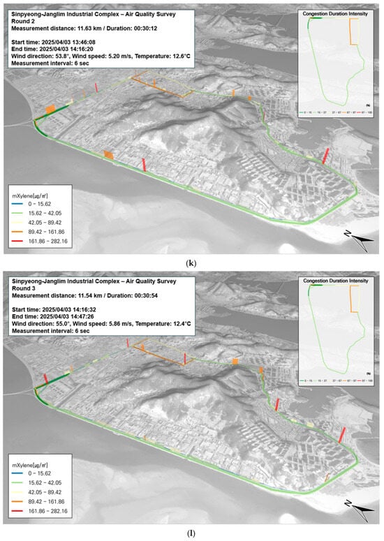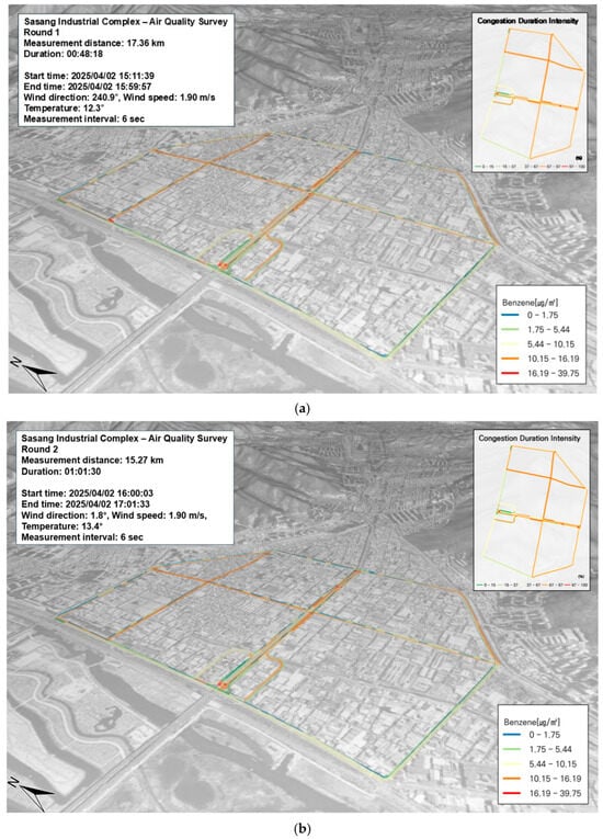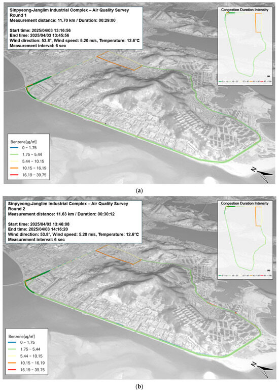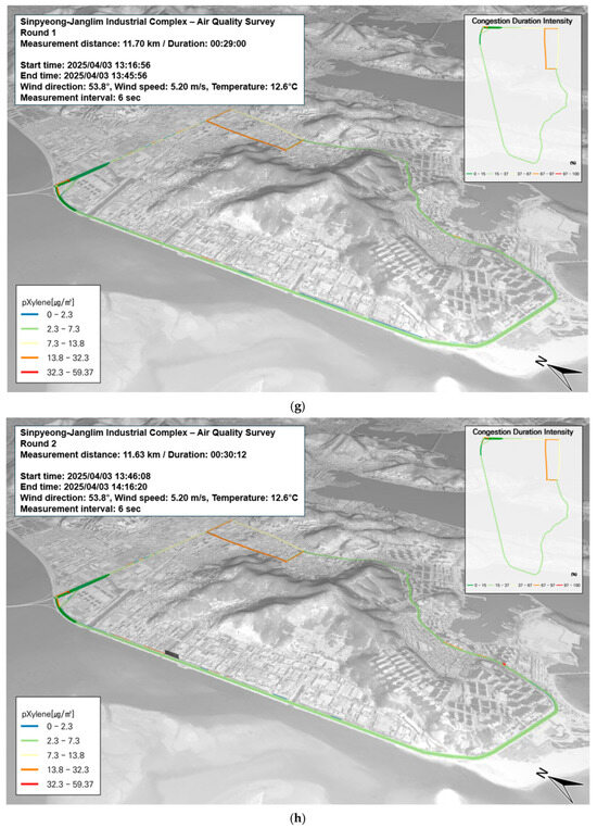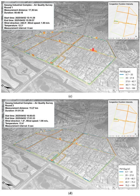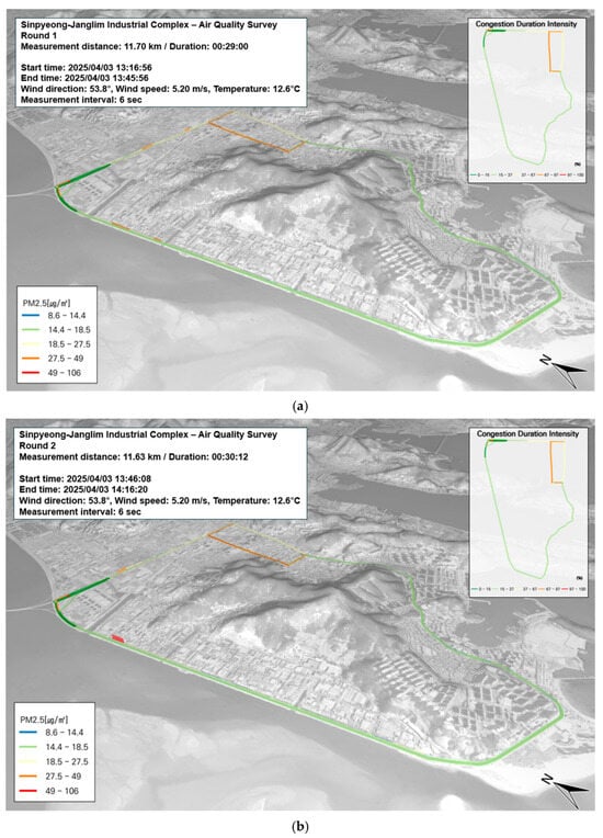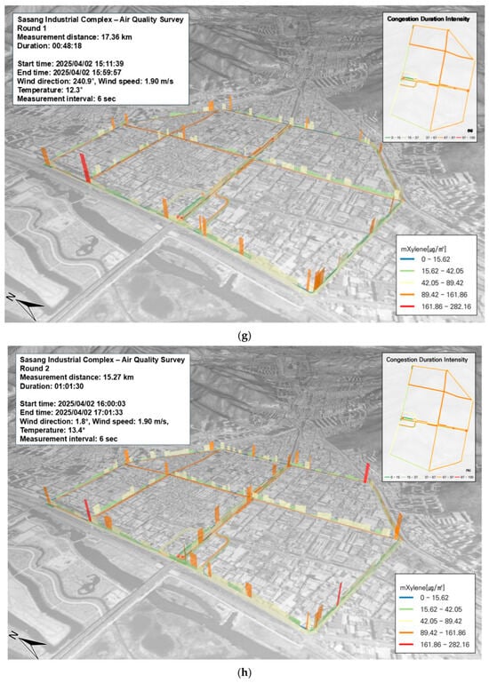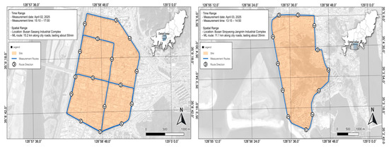The field campaign was conducted over two weekdays—2 and 3 April—during the spring season. In total, ten measurement runs were completed: four on 2 April (9:00–11:00 a.m. and 2:00–4:00 p.m.) and six on 3 April (9:00–11:00 a.m. and 1:00–3:00 p.m.). Each industrial complex—Sasang and Saha Sinpyeong–Janglim—was surveyed for approximately 4 to 5 h in total, with mobile transects conducted during both morning and afternoon sessions to capture diurnal variations in traffic and meteorological conditions. It should be noted that night-time boundary layer dynamics and weekend industrial shift operations were not included in the survey scope.