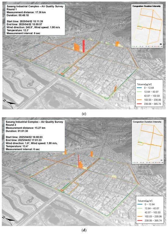 Spatiotemporal distributions were analyzed by collecting mobile data along pre-defined routes traversing both residential and industrial areas. Data were synchronized with GPS and meteorological information, including wind direction and speed, and visualized using GIS-based 3D mapping. Although wind data were considered to interpret VOC patterns, this study did not include dispersion modeling or mixing height analysis. We acknowledge that these factors, along with temporal meteorological variability, may influence pollutant distributions and warrant consideration in future research. The survey was conducted during spring (April), when PM levels are typically elevated due to meteorological influences. This integrated approach allowed for the examination of relationships between VOC concentrations and variables such as traffic congestion, facility types, and spatial patterns. Although the mobile monitoring campaign was conducted over a limited period of two days in April—a season typically characterized by elevated PM concentrations due to meteorological factors—it may not fully represent long-term pollutant trends. However, unlike fixed monitoring stations, mobile measurements involve practical constraints such as vehicle and instrument rental, route scheduling, and real-time equipment operation. Despite these limitations, mobile monitoring offers valuable insights into spatial patterns and localized pollution hotspots, serving as a complementary tool to fixed monitoring networks. Future studies will aim to extend the monitoring duration across multiple seasons and integrate the results with conventional fixed-site monitoring data to enhance representativeness and temporal coverage.
