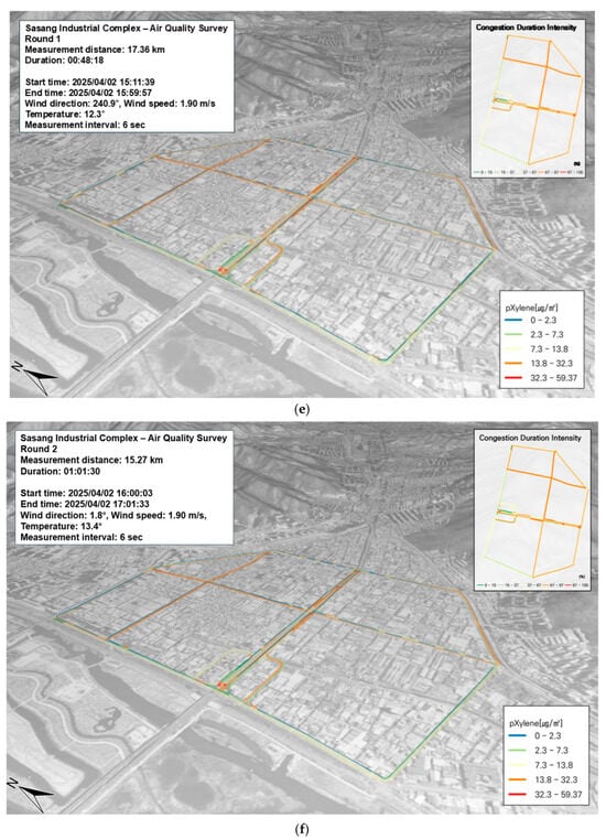 In the Sasang Industrial Complex, p-xylene accounted for 1.7% of the total BTEX composition among VOCs, indicating a relatively minor contribution. p-Xylene is commonly used as a raw material in the production of PET bottles and snack packaging. The average concentration of p-xylene measured in the study area was 1.2 ± 3.1 µg/m3, with a maximum observed value of 29.55 µg/m3. As illustrated in Figure 4e,f, although the section exhibited significant traffic congestion, no areas showed notably elevated p-xylene concentrations. Therefore, the correlation between traffic volume and p-xylene concentration appears to be weak.