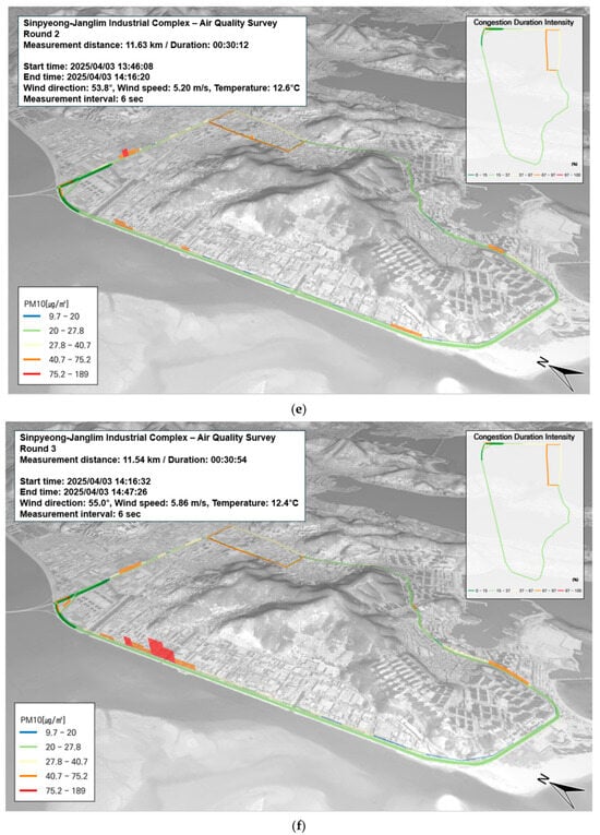 This study utilized GIS to derive results that reflect spatiotemporal characteristics according to time of day. In addition to the overall correlation analysis, we also examined the spatial and temporal patterns by mapping the data for each time period and location. PM10 and PM2.5 concentrations were recorded at 6 s intervals. Given the known correlation between fine particulate matter and road traffic, the level of congestion along the measurement path was analyzed to identify pollution hotspots. Although the overall traffic volume in the area was low, elevated PM concentrations were observed in certain segments, particularly those illustrated in Figure 5c,e,f. These areas were characterized by a high density of manufacturing facilities, including machinery and equipment plants, that were located immediately adjacent to the roadside. It is presumed that the elevated concentrations result from a combination of emissions from industrial activity and roadside vehicle operations, including gas station usage.