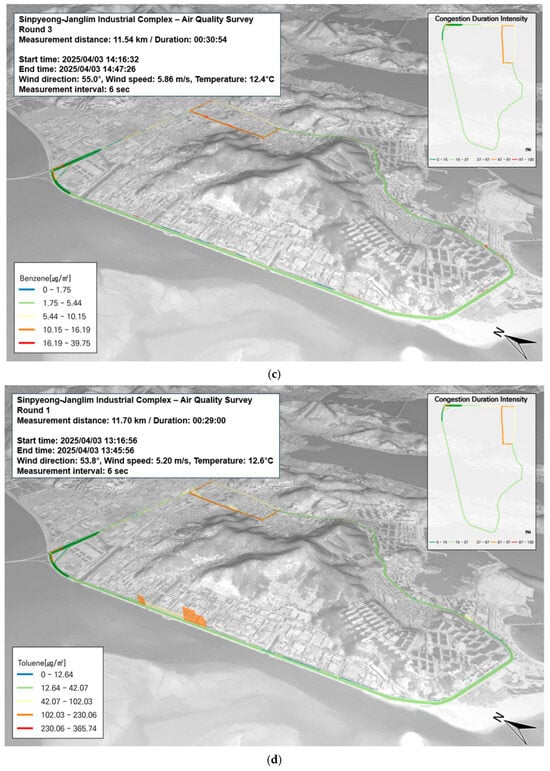 In the Saha Sinpyeong–Janglim Industrial Complex, benzene was selected as the representative BTEX compound for evaluation. The current air quality standard for benzene is set at an annual average of 1.5 ppb. Among all study areas, the highest benzene concentration was observed in the Sasang Industrial Complex during the measurement period, with a peak value of 39.75 µg/m3 and an average of 7.3 ± 5.9 µg/m3. In contrast, throughout the three measurement runs conducted in the Saha Sinpyeong–Janglim Complex, no locations exhibited relatively elevated concentrations. As shown in Figure 6a–c, benzene levels in this area appeared to be unrelated to road traffic congestion.