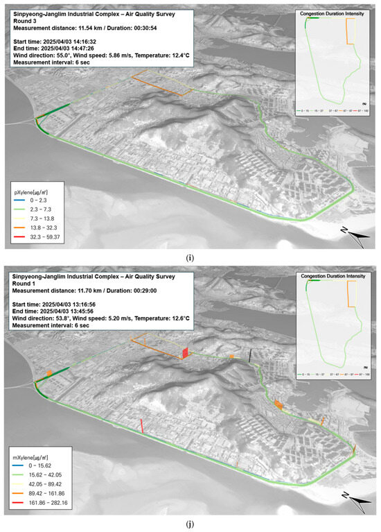 Temporal and spatial distribution of VOCs (BTEX) from mobile measurements conducted on 2 April: (a) benzene, first run; (b) benzene, second run; (c) toluene, first run; (d) toluene, second run; (e) p-Xylene, first run; (f) p-Xylene, second run; (g) m-Xylene, first run; (h) m-Xylene, second run; (i) ethylbenzene, first run; (j) ethylbenzene, second run.