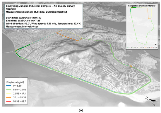 In the Saha Sinpyeong–Janglim Industrial Complex, ethylbenzene accounted for 12.7% of the total BTEX concentration among VOCs. Ethylbenzene is commonly used as a solvent in the production of synthetic rubber, paints, adhesives, pesticides, and automobile fuels. The average concentration measured in the study area was 7.8 ± 11.8 µg/m3, with a maximum value of 61.0 µg/m3. As shown in Figure 6m–o, the area exhibited generally low traffic congestion, and no specific locations exhibited relatively high ethylbenzene concentrations. These results suggest that the correlation between traffic volume and ethylbenzene levels in this area is low.