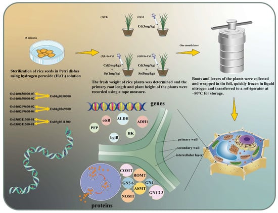 The rice variety used in this experiment was Chunyou 987 Japonica. This variety is a Japonica-type three-line hybrid rice bred by the China Rice Research Institute, which has been planted on a large scale in China. To avoid the influence of the external environment on the experiment, we chose to cultivate rice in a room with a relative humidity of 70% ± 5%, a constant temperature of 25 °C, a light–dark cycle of 14/10 h, and a light intensity of 176 μmol m2/s. We used 1/4 Hoagland nutrient solution (Table S1) for rice cultivation and watered every 5 days to promote germination and growth. Rice seeds of similar size with intact kernels were first sterilized by soaking in H2O2 and then repeatedly rinsed well. The seeds were then placed in Petri dishes at a constant temperature of 25 °C and kept in the dark for 2 days, alternating with 5 days of light to promote germination. After germination, rice seedlings were transferred to pots (with 350 g of soil in the pots), after which 150 g of soil was evenly covered; the soil used in this experiment was sterilized rice soil with a pH of 6.6. Three pots were planted for each treatment, with about 30 seedlings per pot. In this experiment, the concentrations of Se and Cd were selected according to the relevant standards (GB15618-2018) [], with a Cd concentration of 3 mg/kg, a low Se concentration of 1 mg/kg and a high Se concentration of 5 mg/kg. Cd and Se were added to the soil as CdCl2 and Na2SeO3 solutions, respectively. Therefore, four treatments were designed in this experiment, namely, CK group without Cd and Se addition, Cd group with 3 mg/kg Cd addition, L-Se-Cd group with 3 mg/kg Cd and 1 mg/kg Se addition, and H-Se-Cd group with 3 mg/kg Cd and 5 mg/kg Se addition, where L-Se-Cd group and H-Se-Cd group are abbreviated as L and H, respectively. The experimental flow is shown in Figure 1.
