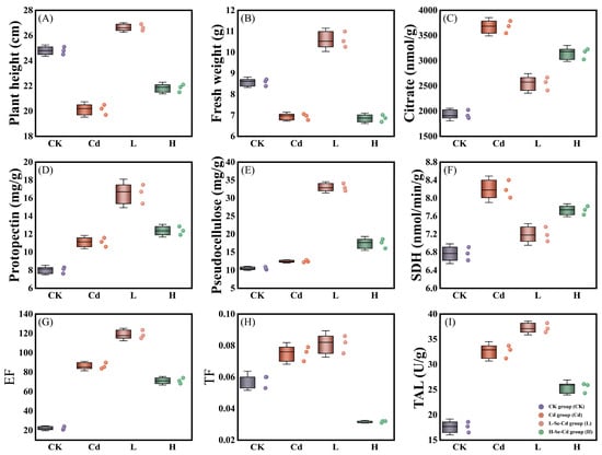 In the present study, rice seedlings were divided into four treatments, in which fresh weight and plant height showed the same trend. Compared with the control, fresh weight and plant height were significantly suppressed after adding Cd. After the addition of a low concentration of Se, not only did the inhibition phenomenon disappear, but it also promoted the growth of rice seedlings to some extent. Inhibition again occurs when the concentration of added Se is too high (Figure 2 and Figure S1). Afterward, protopectin, hemicellulose, and various enzymes in rice seedlings were determined. The experimental results showed that the concentration of protopectin in the Cd group and the group treated with a low concentration of Se showed a gradual increase. The hemicellulose concentration in the Cd group was only slightly higher than that in the control group, while the hemicellulose concentration increased significantly after the addition of a low concentration of Se. In contrast to low concentrations of Se, high concentrations inhibit the formation of protopectin and hemicellulose (Figure 2D,E). The changes in citrate and SDH showed the same trend. Cd significantly promoted the synthesis of both substances compared to the control group and was then inhibited after adding low concentrations of Se. At the same time, the addition of high concentrations of Se boosted it in contrast to low concentrations of Se, but the boosting effect was not as pronounced as that of the Cd group (Figure 2C,F). Changes in TAL were again different, with the enzyme synthesis progressively promoted in the Cd group and the low-concentration Se treatment compared to the control group. However, the promotion was reduced in the high-concentration Se treatment (Figure 2G). The EF for Cd was similar to the changes in TAL (Figure 2H). The changes in Cd’s TF were again different, showing a gradual increase in the TF in the Cd group and the low-concentration Se treatment compared to the control group. In contrast, the transporter factor of Cd was inhibited in the high-concentration Se treatment (Figure 2I).