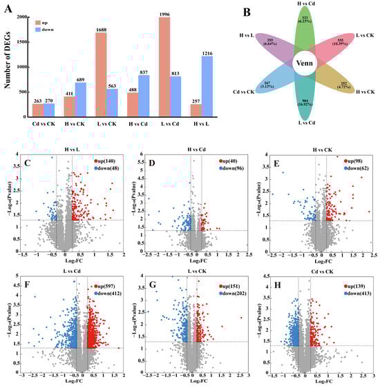 We compared differentially regulated proteins for the four treatment groups (Figure 3C–H). A total of 136 differentially regulated proteins (e.g., OsRLCK89 and OsVPS2, etc.) were identified in H vs. Cd, and 96 were down-regulated and 40 were up-regulated (Figure 3D). In L vs. Cd by 1009 differentially regulated proteins (e.g., PsbR, OsMT3a, PsaK, and PsaN, etc.), 412 were down-regulated, and 597 were up-regulated (Figure 3F). There were 552 differentially expressed proteins (e.g., OsSGT, RBBI3, and OsPR1, etc.), 413 of which were down-regulated and 139 of which were up-regulated in Cd vs. CK (Figure 3H).