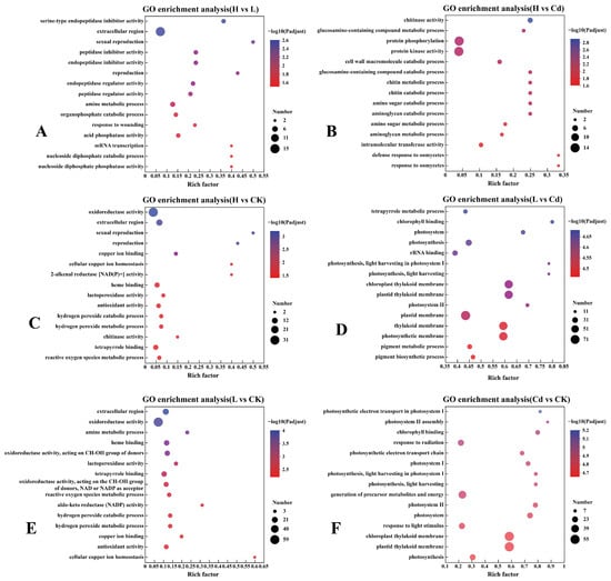 GO enrichment analysis of differentially expressed proteins in the rice root proteome in six contrasting groups. (A) H vs. L, (B) H vs. Cd, (C) H vs. CK, (D) L vs. Cd, (E) L vs. CK, and (F) Cd vs. CK.