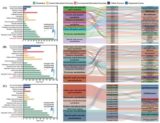 Functional annotation of differentially expressed genes in the rice root transcriptome. KEGG terms:(A) H vs. Cd, (B) L vs. Cd, (C) Cd vs. CK. Assignment of graphene oxide terms for different categories of metabolism, genetic information processing, environmental information processing, cellular processes, and organismal systems, and the pathways of carbohydrate metabolism corresponding to genes and enzymes.