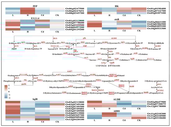 There is still much confusion about the role of cell wall polysaccharides in resistance to toxic heavy metals, especially because the molecular and genetic mechanisms that promote polysaccharide synthesis are still unclear []. When rice cells are exposed to toxic substances, functional groups such as hydroxyl, carboxyl, and aldehyde groups in the root cell wall bind to the toxic ions, thus preventing the toxic substances from entering the plant []. In order to further characterize the genes for key enzymes of polysaccharide synthesis induced by the effects of Cd and Se, the root systems of rice seedlings were subsequently subjected to transcriptome analysis. It has also been shown that the rice cell wall responds differently to Cd detoxification-related pathways under Cd stress conditions, including “AsA-GSH Cycle”, “cell wall formation and remodeling”, and “amino acid and terpene metabolism” []. The results showed that DEGs localized to metabolic pathways were mainly enriched in the “amino and nucleotide sugar metabolism” and “starch and sucrose metabolism” pathways. It was particularly evident in the “energy metabolism”, “carbohydrate metabolism”, and “amino acid metabolism” pathways (Figure 5). It was further shown that the content of cell wall polysaccharides regarding heavy metal binding was significantly increased under Cd stress. In the process of analysis using KEGG, 39 critical enzymes related to polysaccharide biosynthesis were identified (Table S2). Seven key enzymes with the most genes were found, namely bglB, E3.2.1.4, otsB, PFP, HK, ALDH, and ADH1, and these seven key enzymes were subjected to heatmap analysis in the case of the four treatment groups (Figure 6), which also confirmed the existence of antagonism between Se and Cd in plants []. The expression level of these enzymes in rice cells largely determines the extent of cell wall polysaccharide accumulation under Cd and Se stress, and the single-gene characterization of these enzymes may provide a basis for subsequent studies on other essential enzymes involved in cell wall polysaccharide biosynthesis [].