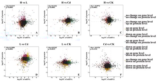 Correlation analysis of transcriptomics and proteomics data in rice roots under Se-mediated Cd stress. (A–F) Nine-quadrant plots represent cross-comparisons of genes and proteins. (A) H vs. L, (B) H vs. Cd, (C) H vs. CK, (D) L vs. Cd, (E) L vs. CK, and (F) Cd vs. CK. These values indicate the number of genes/proteins occurring in the different quadrants.