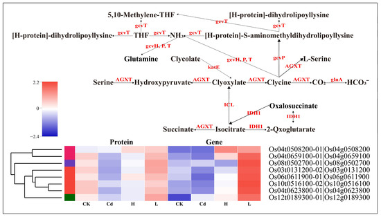 Se-mediated metabolic pathway analysis of transcriptomic and proteomic data in rice roots under Cd stress. The graphs show the expression levels of the shared genes/proteins encoding the enzymes at each step. The four columns correspond to CK, Cd, H, and L comparisons. Colors indicate a log2-fold change in values (stressed vs. control).