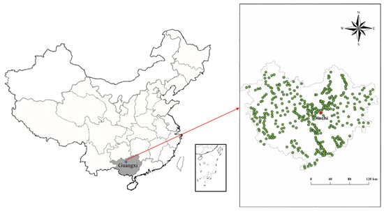 The study zone (106.57°–109.15° E, 23.68°–25.62° N) is located in the southwestern karst area of Guangxi Province, China (Figure 1). Over 80% of the excess in heavy metals in the karst area was caused by regional geological background and soil weathering []. In addition, mining and irrigation by polluted river water or groundwater are other important factors leading to excessive heavy metals in cultivated soil.