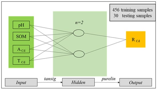 In order to accurately and rapidly predict Cd content in rice by using basic soil property parameters. This study uses MATLAB (2015) to build a neural network model, with SOM, pH, ACd, and TCd as input parameters and RCd as output parameters (Figure 2). These indicators will be measured, and a database will be established during the national soil survey. Our model will also be submitted to the government, which will extract data from the database to use this model for predicting Cd content in rice and creating a predictive distribution map of rice quality and safety in Guangxi. The structure of the BP-ANN consists of an input layer, a hidden layer, and an output layer, which includes multiple neurons, and each layer is linked by connection weights. The number of neurons in the input and output layers depends on the input and output variables, respectively. One (or more) hidden-neuron layer receives weight from each input neuron and adds them up to a weight value and then passes the results through a non-linear function [].