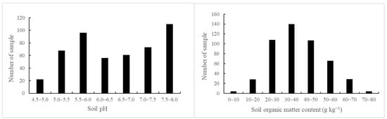 Data on soil properties and RCd are listed in Table 1. Soil pH ranged from 4.43 to 8.02. There are 242 samples having acidity values below 6.5, accounting for 50% of the total samples (Figure 3), and more differences in soil pH were due to the two main types of soil in the study area. One is red soil, with the characteristic of acidity to strong acidity, and the pH is usually in the range of 4–6. The other is limestone soil, usually 7.5–8.5 of alkaline pH. Further, SOM ranged from 4.07 g kg−1 to 75.43 g kg−1 with an average value of 38.44 g kg−1 (Figure 3). The content of organic matter was mainly in the range of 20–50 g kg−1, which belongs to the normal content range. Samples with SOM below 20 g kg−1 account for 6.6% of the total samples, indicating that the surveyed soil was fertile.