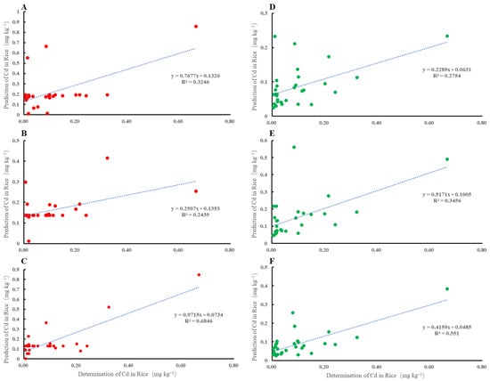 It was found that RPD values were above 2.342, which means that rice Cd content could be attributed to soil pH, OM, and TCd using MLR models, but the accuracy was lower than the best ANN model II (RPD 2.488) and the best ANN model III (RPD 2.422).