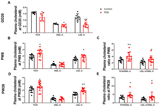 Effects of prenatal dexamethasone exposure (PDE) on plasma cholesterol phenotypes in rat offspring. (A,B,D) Plasma levels of total cholesterol (TCH), high-density lipoprotein cholesterol (HDL-C), and low-density lipoprotein cholesterol (LDL-C) on gestational day (GD) 20, postnatal day (PW) 8, and PW28. (C,E) Plasma levels of the TCH/HDL-C and LDL-C/HDL-C ratios at PW8 and PW28. Mean ± SD. n = 6 for the intrauterine period and 12 for after birth. Student’s t-tests were used to compare the control and PDE group differences. * p < 0.05, ** p < 0.01 vs. control group.