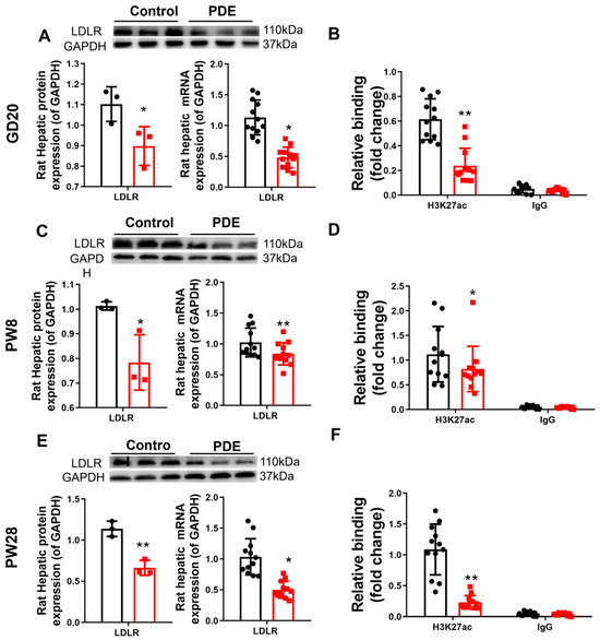 Effects of prenatal dexamethasone exposure (PDE) on hepatic low-density lipoprotein receptor (LDLR)and histone 3 lysine 27 acetylation (H3K27ac) levels in fetal and adult offspring rats. (A,C,E) mRNA and protein expression of hepatic LDLR at gestational day (GD) 20, postnatal day (PW) 8, and PW28. (B,D,F) Levels of H3K27ac at the promoter region of hepatic LDLR at GD20, PW8, and PW28. n = 12 for mRNA expression and chromatin immunoprecipitation (ChIP)-PCR, n = 3 for protein expression. Mean ± SD. Student’s t-tests were used to compare the differences between the control and PDE groups. * p < 0.05, ** p < 0.01 vs. control group.