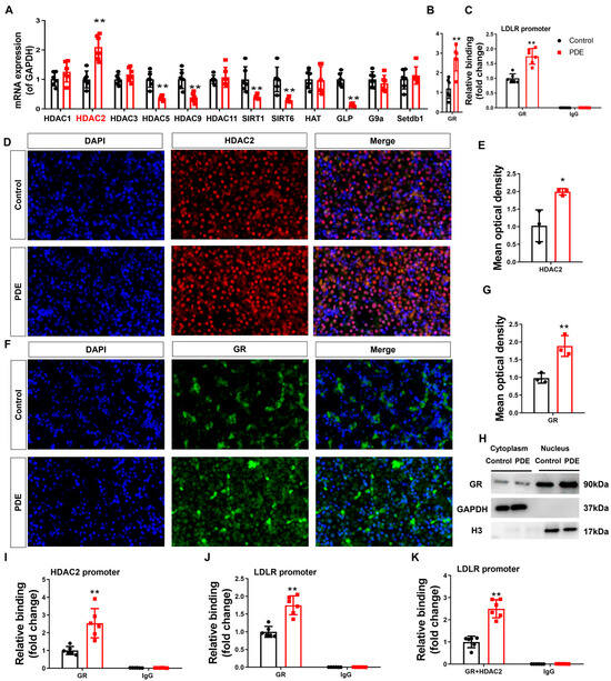 To understand the intrauterine origin basis of PDE-d-induced H3K27ac depletion at the LDLR promoter in male offspring rats, we first identified potential epigenetic enzymes involved in regulating fetal hepatic epigenetic modifications. Our data demonstrated significantly elevated HDAC2 mRNA and protein levels in the fetal livers of male PDE offspring compared to controls (p < 0.01, p < 0.05, Figure 3A,D,E). Enhanced HDAC2 binding to the LDLR promoter was confirmed by ChIP assays (p < 0.01, Figure 3C), indicating PDE-induced HDAC2 upregulation and promoter interactions. GR analysis in the fetal liver revealed increased mRNA expression (p < 0.01, Figure 3B), protein expression, nuclear translocation (p < 0.01, Figure 3F–H), and strengthened binding to both HDAC2 and the LDLR promoter (p < 0.01, Figure 3I,J) in the PDE groups. Re-ChIP validated intensified co-binding of GR/HDAC2 at the LDLR promoter (p < 0.01, Figure 3K), demonstrating PDE’s ability to amplify GR-HDAC2 collaboration at cholesterol regulatory loci.
