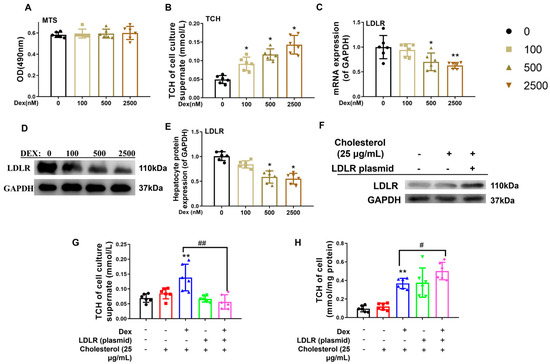 Low-density lipoprotein receptor (LDLR) mediated the changes in cholesterol levels in L02 cells induced by dexamethasone. (A) Optical density (OD) value by the 3-(4,5-dimethylthiazol-2-yl)-5-(3-carboxymethoxyphenyl)-2-(4-sulfophenyl)-2H-tetrazolium, inner salt (MTS) analysis. (B) Total cholesterol (TCH) levels in cell culture supernatants treated with different doses of dexamethasone for 24 h. (C) mRNA expression of cholesterol metabolism genes, such as sterol regulatory element binding protein 2 (SREBP2), HMG CoA reductase (HMGCR), apolipoprotein B (ApoB), scavenger receptor B1 (SR-B1), and LDLR, treated with different doses of dexamethasone for 24 h. (D,E) Protein expression of cholesterol metabolism genes, such as HMGCR, SREBP2, ApoB, SR-B1, and LDLR after treatment with different doses of dexamethasone for 24 h. (F) Protein expression of LDLR treated with LDLR plasmid or 25 μg/mL of cholesterol. (G) TCH levels in culture supernatant treated with 25 μg/mL cholesterol, 500 nM dexamethasone, and/or LDLR plasmid for 24 h. (H) TCH levels in L02 cells treated with 25 μg/mL cholesterol, 500 nM dexamethasone, and/or LDLR plasmid for 24 h. n = 6. Mean ± SD.One-way ANOVA with post-hoc tests was used to analyze multiple group comparisons. * p < 0.05, ** p < 0.01 vs. control groups; # p < 0.05, ## p < 0.01 vs. corresponding interference group.