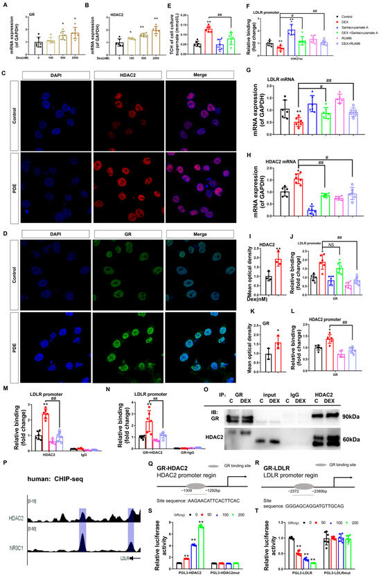 Glucocorticoid receptor-histone deacetylase 2 (GR-HDAC2) signaling mediates the dexamethasone-induced reduction in low-density lipoprotein receptor (LDLR) histone 3 lysine 27 acetylation (H3K27ac) and mRNA expression levels in L02 cells. (A,B) mRNA expression of GR and HDAC2. (C,D,I,K) Protein expression of HDAC2 and GR was determined by immunofluorescence. (E) H3K27ac levels at the LDLR promoter. (F) mRNA expression of LDLR. (G) Total cholesterol (TCH) levels in the cell culture supernatant. (H) GR binding to the promoter of LDLR. (J) mRNA expression of HDAC2. (L) GR binding to the promoter of HDAC2. (M) HDAC2 binding to the promoter of LDLR. (N) GR and HDAC2 binding to the promoter of LDLR as determined by re-ChIP. (O) GR and HDAC2 binding by Co-IP analysis. (P) Analysis of GR (NR3C1) and HDAC2 at the LDLR promoter by ChIP-seq. (Q) Glucocorticoid-responsive element (GRE) in the human HDAC2 promoter region. (R) GRE in the human LDLR promoter region. (S) Luciferase activity of HDAC2 when transfected with HDAC2-GRE and different concentrations of GR plasmids. (T) Luciferase activity of LDLR when transfected with LDLR-negative glucocorticoid responsive element (nGRE) and different concentrations of GR plasmid. n = 6. Mean ± SD. One-way ANOVA with post-hoc tests was used to analyze multiple group comparisons. * p < 0.05, ** p < 0.01 vs. control groups; # p < 0.05, ## p < 0.01 vs. corresponding interference group.