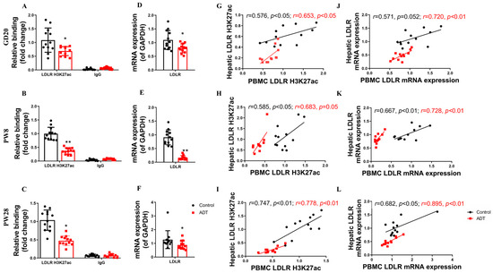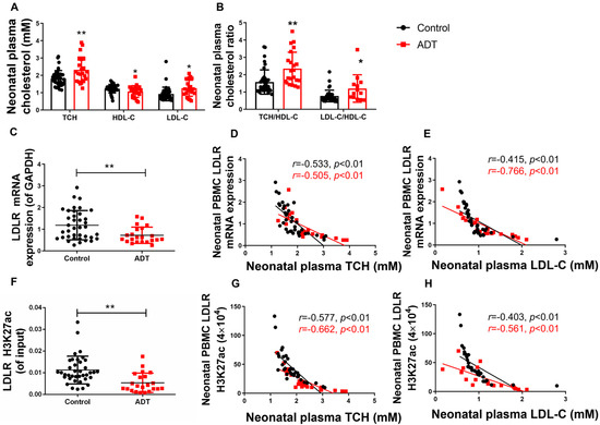 The low-density lipoprotein receptor (LDLR) histone 3 lysine 27 acetylation (H3K27ac) and mRNA expression levels in peripheral blood mononuclear cells (PBMC) and their correlation with the plasma total cholesterol/low-density lipoprotein-cholesterol (TCH/LDL-C) in male neonates who received antenatal dexamethasone treatment (ADT). (A) Plasma levels of TCH, high-density lipoprotein cholesterol (HDL-C), and LDL-C; (B) Plasma TCH/HDL-C and LDL-C/HDL-C concentration ratios; (C) PBMC LDLR mRNA expression (Black represents the Control group red represents the ADT group); (D) Correlation between PBMC LDLR expression and plasma TCH level; (E) Correlation between PBMC LDLR expression and plasma LDL-C level; (F) PBMC LDLR promoter H3K27ac level; (G) Correlation between PBMC LDLR promoter H3K27ac level and plasma TCH level; (H) Correlation between PBMC LDLR promoter H3K27ac level and plasma LDL-C level. n = 22 for the ADT group and n = 38 for the control group, mean ± SD. Intergroup comparisons were analyzed using Student’s t-tests, with 95% CIs for mean differences and effect sizes reported as Cohen’s d. * p < 0.05, ** p < 0.01 vs. control group.