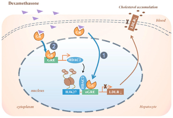 In conclusion, dexamethasone stimulated GR activation and translocation to the nucleus in hepatocytes. This process has two main effects. First, GR directly binds to the negative glucocorticoid response element (nGRE) within the LDLR promoter region to downregulate its transcriptional activity. Second, GR interacts with the glucocorticoid response element (GRE) of the HDAC2 promoter to enhance HDAC2 expression, while simultaneously recruiting HDAC2 protein to cooperatively target the nGRE site on the LDLR promoter. This synergistic interaction amplifies the suppression of LDLR expression through the HDAC2-mediated reduction of H3K27ac levels in the LDLR promoter region.