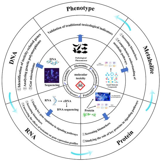 The accelerating pace of global industrialization has led to the unprecedented release of anthropogenic pollutants into aquatic ecosystems, posing significant threats to biodiversity and human health through bioaccumulation and trophic transfer [1]. Ecotoxicology research aims to decipher the mechanistic actions of environmental contaminants—including parent compounds and transformation byproducts—on biological systems [2]. This entails establishing dose–response relationships, identifying toxicity biomarkers, and providing scientific foundations for evidence-based environmental governance. Aquatic ecosystems sustain critical biogeochemical cycles while providing essential services including water purification, nutrient cycling, and habitat provision [3]. Their biotic components span functional groups from vertebrates to planktonic communities, each exhibiting differential vulnerability to pollutants [4]. Traditional ecotoxicological assessments relying on isolated physiological or biochemical endpoints face limitations in elucidating system-level toxicity mechanisms. Computational advances now enable transformative applications of omics technologies (genomics, transcriptomics, proteomics, metabolomics; Figure 1) and their integration [5,6,7]. These high-throughput approaches systematically characterize molecular responses across biological hierarchies, revealing functional perturbations in exposed organisms [6]. The current research landscape of multi-omics applications in environmental toxicology remains predominantly confined to single- or dual-omics approaches. Existing review articles in this field have primarily focused on omics investigations of specific pollutant categories, while conspicuously lacking systematic analyses at either the omics modality or organismal taxonomic level—such as comparative evaluations of the prevalence of particular omics techniques or cross-species differences in omics application patterns. This review systematically evaluates conventional multi-omics integrations applied to common aquatic organisms over the past five years (2019–2024). Through comprehensive literature interrogation, we aim to provide an understanding of the application and problems of multi-omics in different species and explore the current issues that need to be addressed for the development of multi-omics in the field of environmental toxicology.